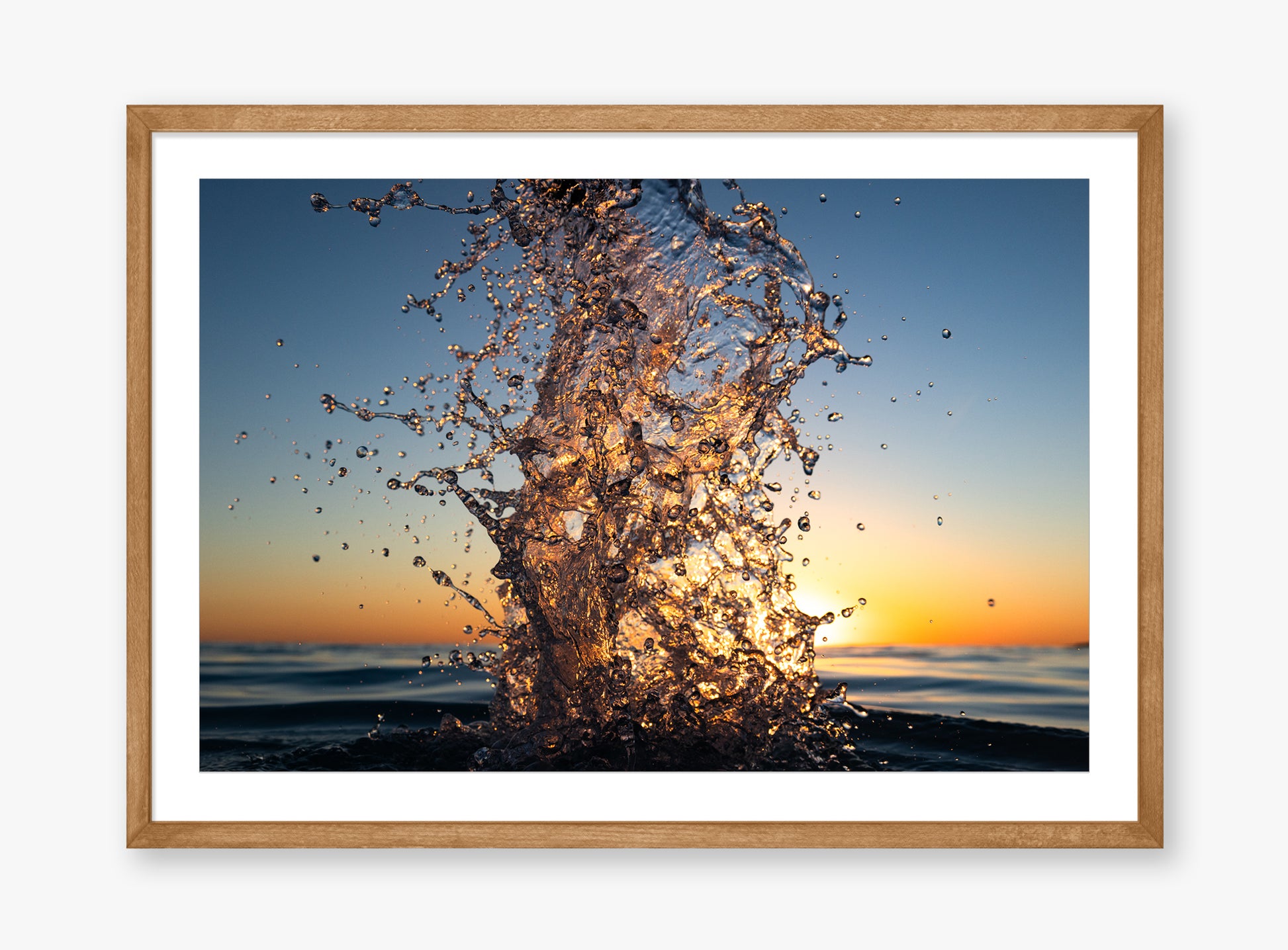 Glass is a fine art print of water rising out of the water to form a glass like sculpture frozen in time. The beautiful sunrise on the horizon shines through with beautiful orange light. Available in a variety of print and framing options.