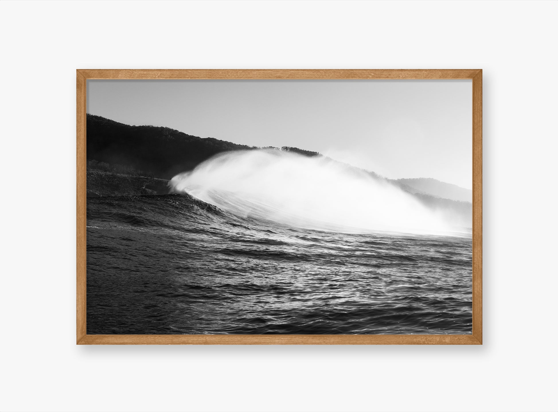 Mist is a black and white print of a moody coastal scene, a wave is breaking with a crisp offshore breeze forming a mist off the back of the wave. Available in a range of print and framing options.