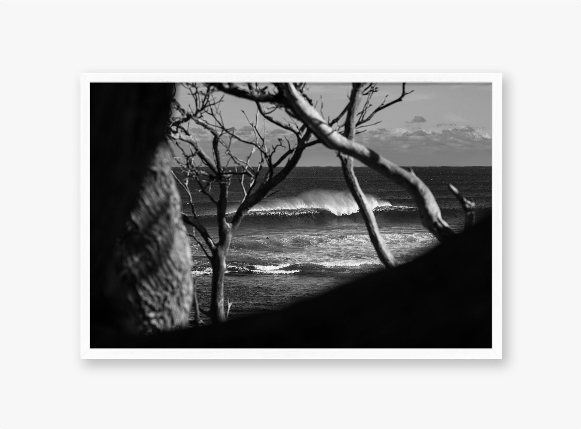 There are three different frame types available for Sam Peatey's Print range, these include Black, White and Tasmanian Oak (Premium Frame). Paper prints come with the option of a border which is a white matting, come fitted with ultra clear glass and are strung ready to be displayed on your walls.